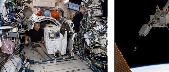 Satellite integration to JEM Small Satellite Orbital Deployer: J-SSOD(left) Satellite deployment (right) images=JAXA/NASA