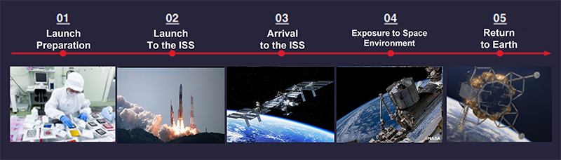 This project makes use of the simple material exposed experiment bracket (ExBAS) installed in the medium exposure experiment adapter (i-SEEP) of the ISS Kibo. Space BD called for participation among a wide range of organizations and is providing a variety of support, including the payload item selection, launch, and the return to Earth.