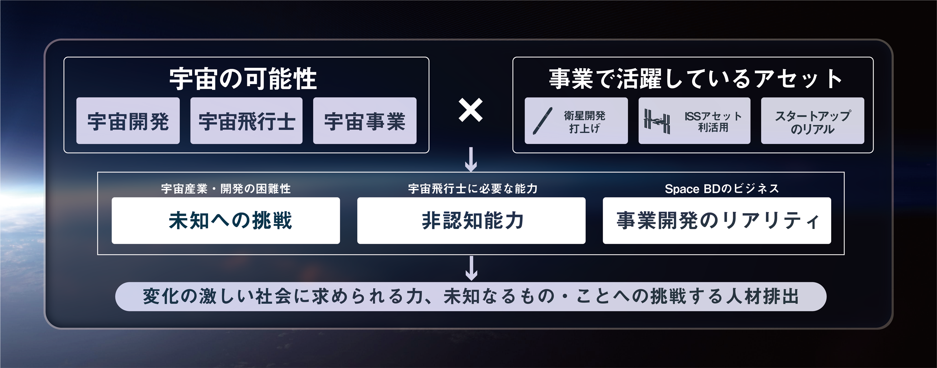 未知への挑戦の体現である宇宙というテーマでこれからの変化の激しい社会に求められる力、未知なるもの・ことへ挑戦する人材を創出します。