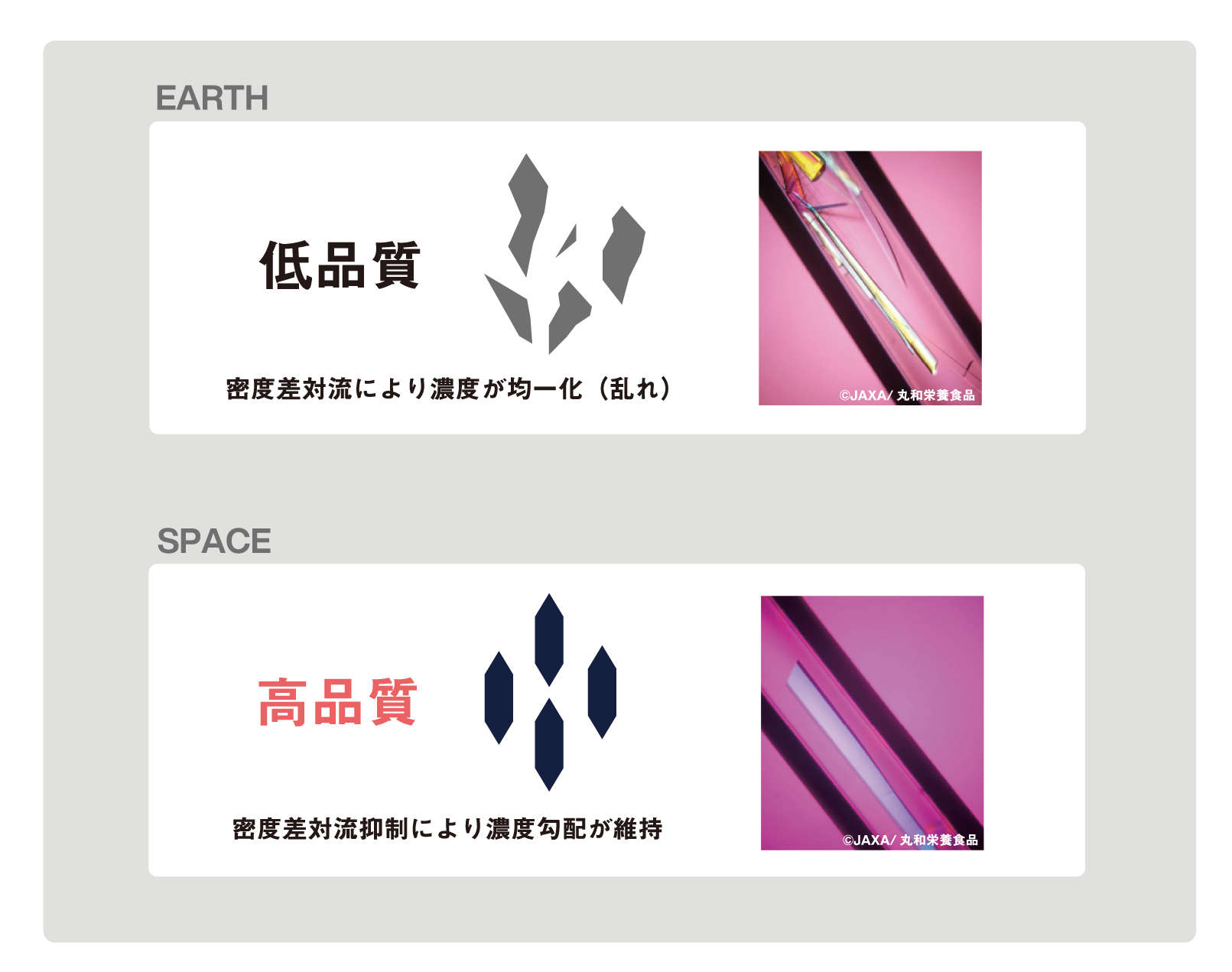 地上では密度差により対流が発生し、結晶核の周りで急激な濃度変化が起こります。これが分子配列の乱れとなり、小さく形のぼやけた結晶が生成されてしまいます。