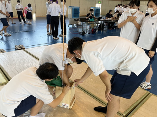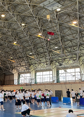 午前中に3学年でチームごとに分かれCanSatの製作を開始し、26日(火)午後、27日(水)・28日(木)午前中に学年別に体育館で地上約8mの高さからCanSatを落下させ、落下速度などの設定された課題をクリアしていき、チームごとにスコアを競い合いました。