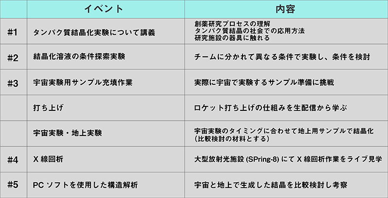 2022年6月からスタートし、阪本泰光教授の特別講義や実際に生徒たちが手を動かした結晶化溶液の調製実験を通じてサンプルが準備され、2022年11月27日にNASA 26th Commercial Resupply Service mission (CRS-26)の一部としてSpaceX社クルードラゴン補給船に搭載され、米国フロリダ州のケネディスペースセンターから打上げられました。