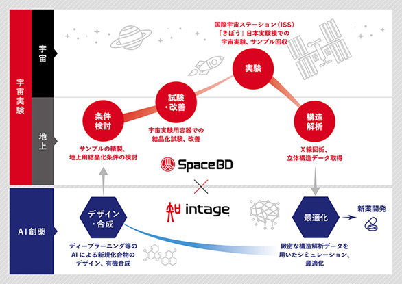 Space BD は、インテージヘルスケアと 2022 年に共同研究契約を締結し、世界でも類を見ない「AI 創薬×宇宙実験」の取り組みを進めてまいりました。国際宇宙ステーション(ISS)の微小重力環境を活用することで、地上実験では得られない高品質なタンパク質結晶を生成し、緻密な構造情報を取得することが可能となります。今回の取り組みは、宇宙実験により得られる精密な構造情報を、世界でも注目される AI 創薬の技術を組み合わせて化合物の最適化技術の開発を行います。これにより、AI創薬モデルの精度向上に大きく貢献することが期待されています。宇宙実験を用いた創薬研究への参画を促し、創薬研究における開発コストと期間の効率化に貢献することで、宇宙実験の可能性の裾野を広げていくことを目標としています。