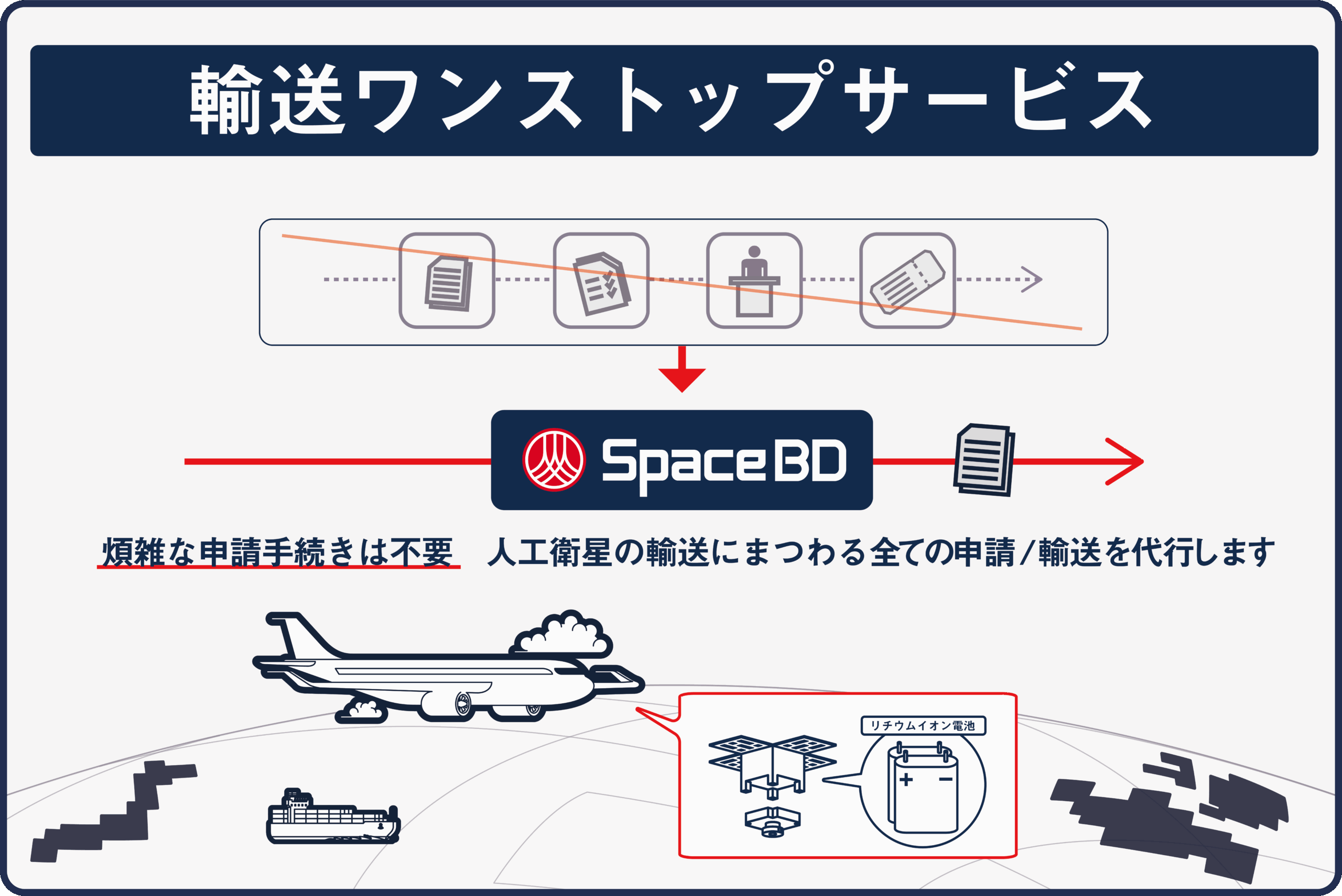 本サービスは、当社が2024年10月に開始した「人工衛星の航空輸送に係る申請代行サービス」を拡張するものです。航空輸送における危険物に関する関係当局へのサポートに加え、今回取得した包括輸出許可を活用することで、海外への人工衛星輸送に必要な関係当局への手続きを一括で対応する「輸送ワンストップサービス」として提供いたします。